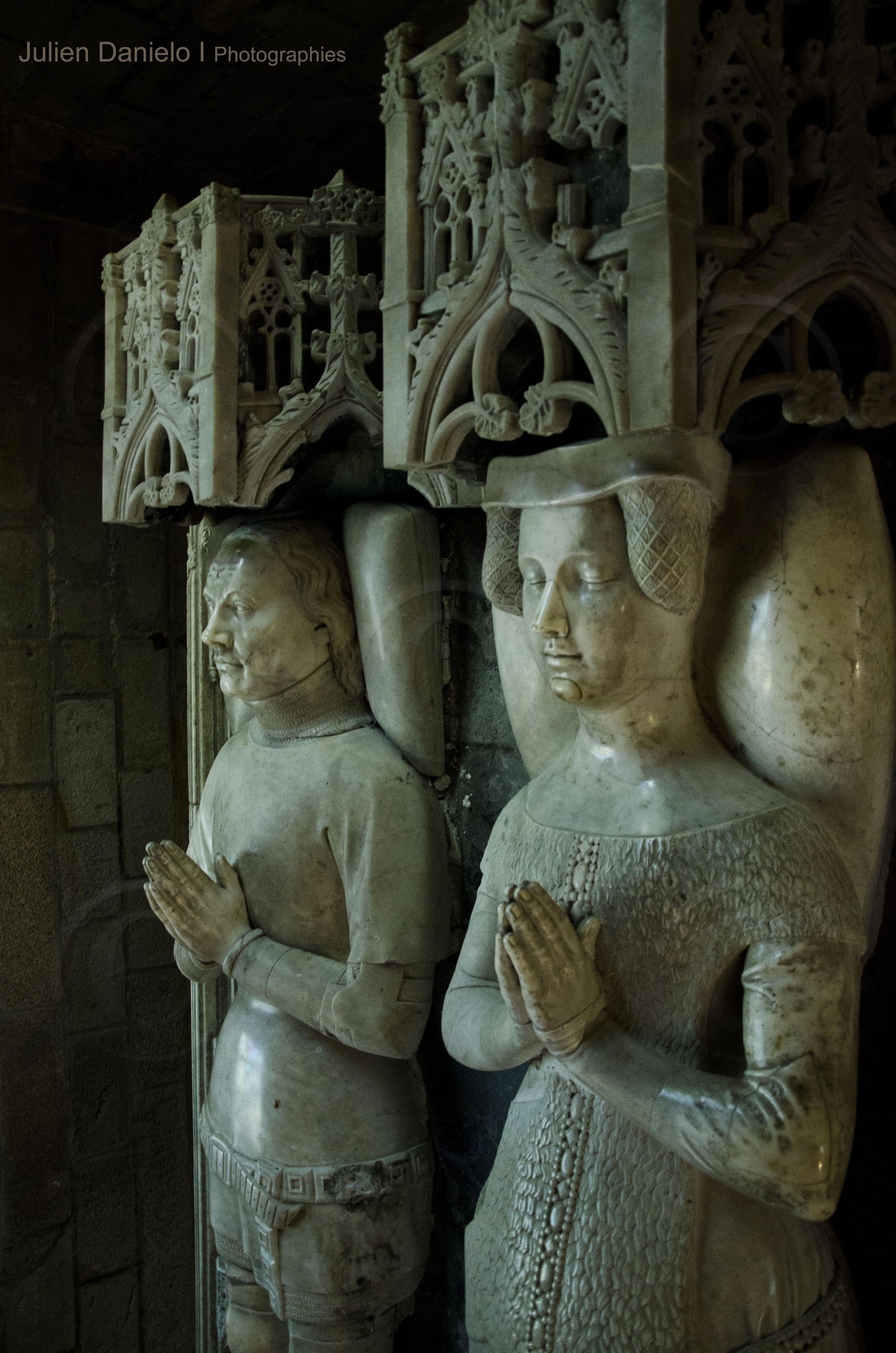 | Description | Après la mort d'Olivier de Clisson, Alain VIII de Rohan, son gendre, commande l'édification d'un tombeau pour accueillir les dépouilles du connétable et de sa seconde femme, Marguerite de Rohan, tombeau qui serait le premier de type tournaisien en Bretagne. Il est constitué d'une table en pierre polie noire supportant les deux gisants représentant les occupants du tombeau. Le visage sculpté d'Olivier de Clisson a été reproduit d'après son masque mortuaire. Placé dans la chapelle de Josselin, le monument est profané en 1793. Les corps en sont extraits. Disposé en milieu de chœur de la basilique Notre-Dame-du-Roncier après une restauration effectuée après la Révolution, le cénotaphe est installé en 1858 dans le transept sud, chapelle Sainte-Marguerite, proche de l'endroit où il se trouve au XXIe siècle. |